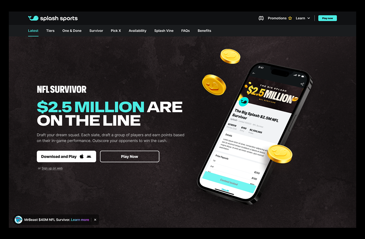 A peer to peer fantasy sports app, Splash Sports allows users and influencers to create contests and put their money where their mouth during multiple different sports seasons in the US. For the 2025 NFL season, it was especially special; Splash was hosting its own contest where first place got a whopping $2.5 million dollars (Yes, hard cold cash) and such a contest required its own look and feel, name, and collateral. That's where I came in!
